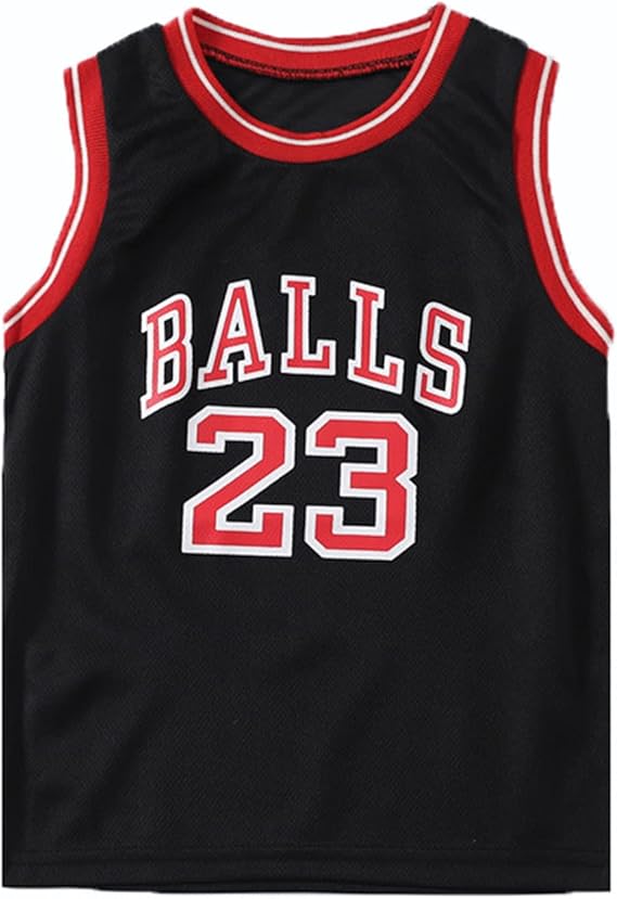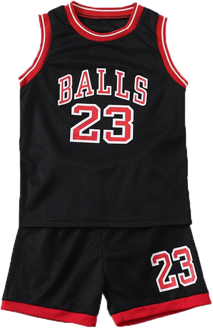 This basketball uniform set features a black main color, simple and elegant. The top is printed with "BALLS" and the number "23", showing sports vitality. The matching shorts also have the number "23" on the side. The fabric is comfortable and breathable, suitable for children's sports wear, enabling them to display full vigor and charm on the basketball court.